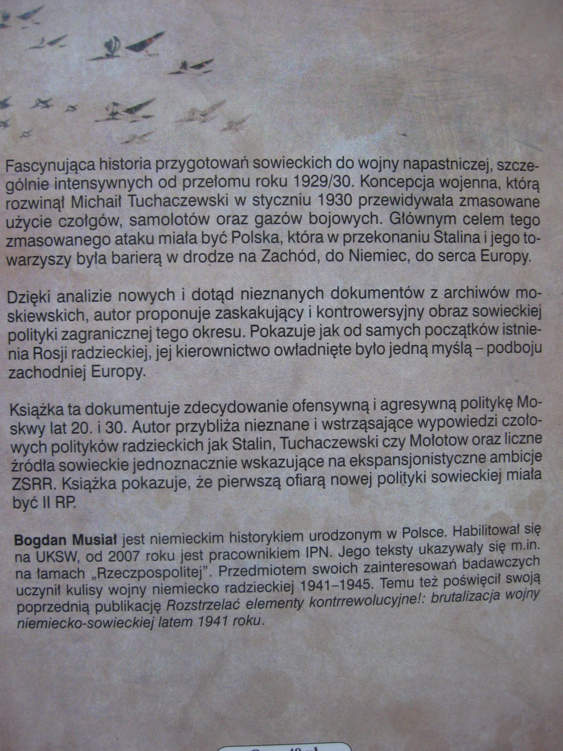 Książka niezwykle aktualna, opierająca się na dokumentach z rosyjskich archiwów, zadaje kłam najnowszej propagandzie historycznej Putina, która powiela stalinowskie fałszerstwa, a której ostrze skierowane jest głównie przeciwko Polsce. Pokazuje historię przygotowań sowieckich do wojny napastniczej, szczególnie intensywnych od przełomu roku 1929/30. Koncepcja wojenna którą rozwinął Michaił Tuchaczewski w styczniu 1930 przewidywała zmasowane użycie czołgów, samolotów oraz gazów bojowych. Głównym celem tego zmasowanego ataku miała być Polska, która w przekonaniu Stalina i jego towarzyszy była barierą w drodze na Zachód, do Niemiec, do serca Europy.
