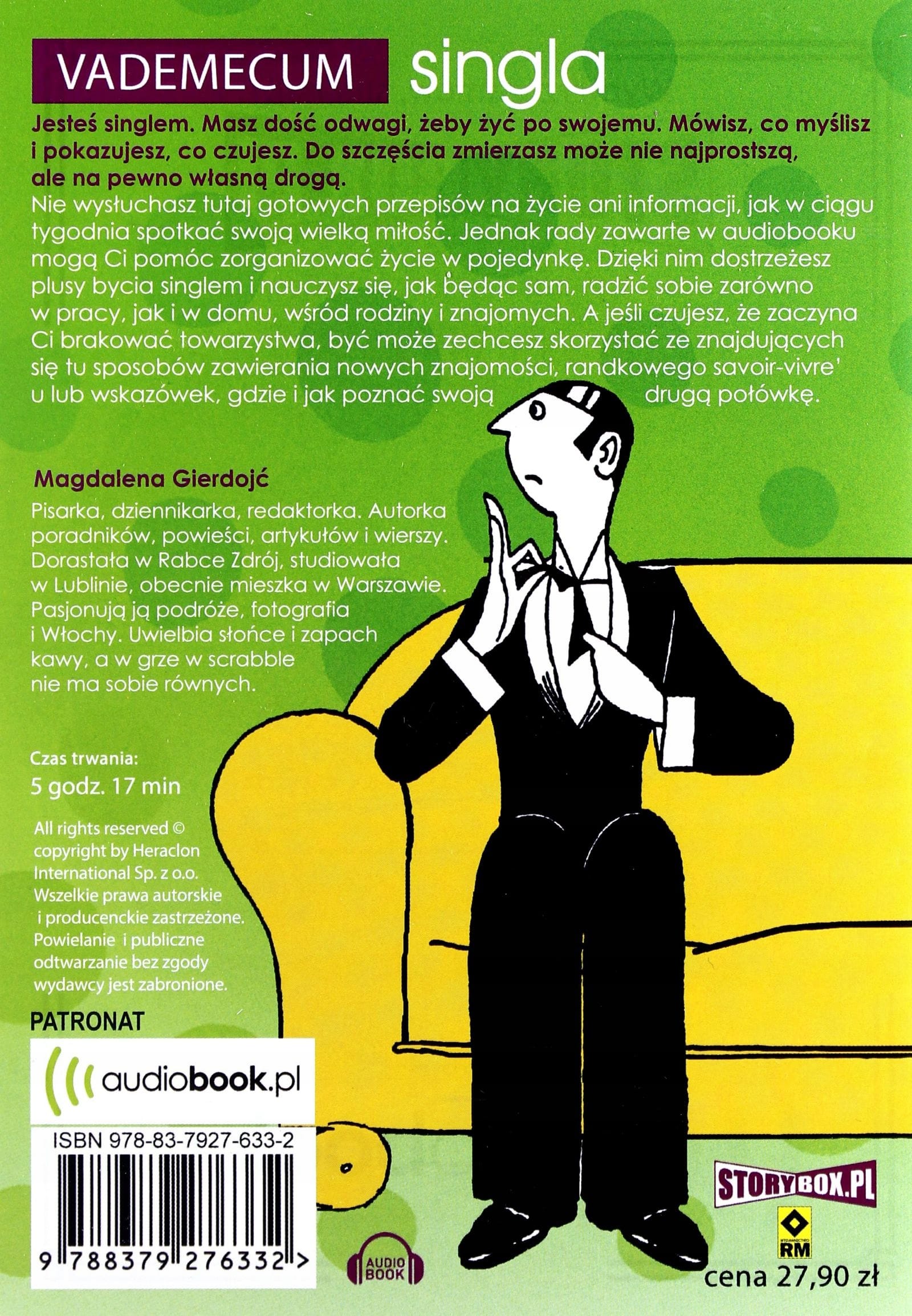 Nie wysłuchasz tutaj gotowych przepisów na życie ani informacji, jak w ciągu tygodnia spotkać swoją wielką miłość. Jednak rady zawarte w audiobooku mogą Ci pomóc zorganizować życie w pojedynkę. Dzięki nim dostrzeżesz plusy bycia singlem i nauczysz się, jak będąc sam, radzić sobie zarówno w pracy, jak i w domu, wśród rodziny i znajomych. A jeśli czujesz, że zaczyna Ci brakować towarzystwa, być może zechcesz skorzystać ze znajdujących się tu sposobów zawierania nowych znajomości, randkowego savoir-vivre’u lub wskazówek, gdzie i jak poznać swoją drugą połówkę.