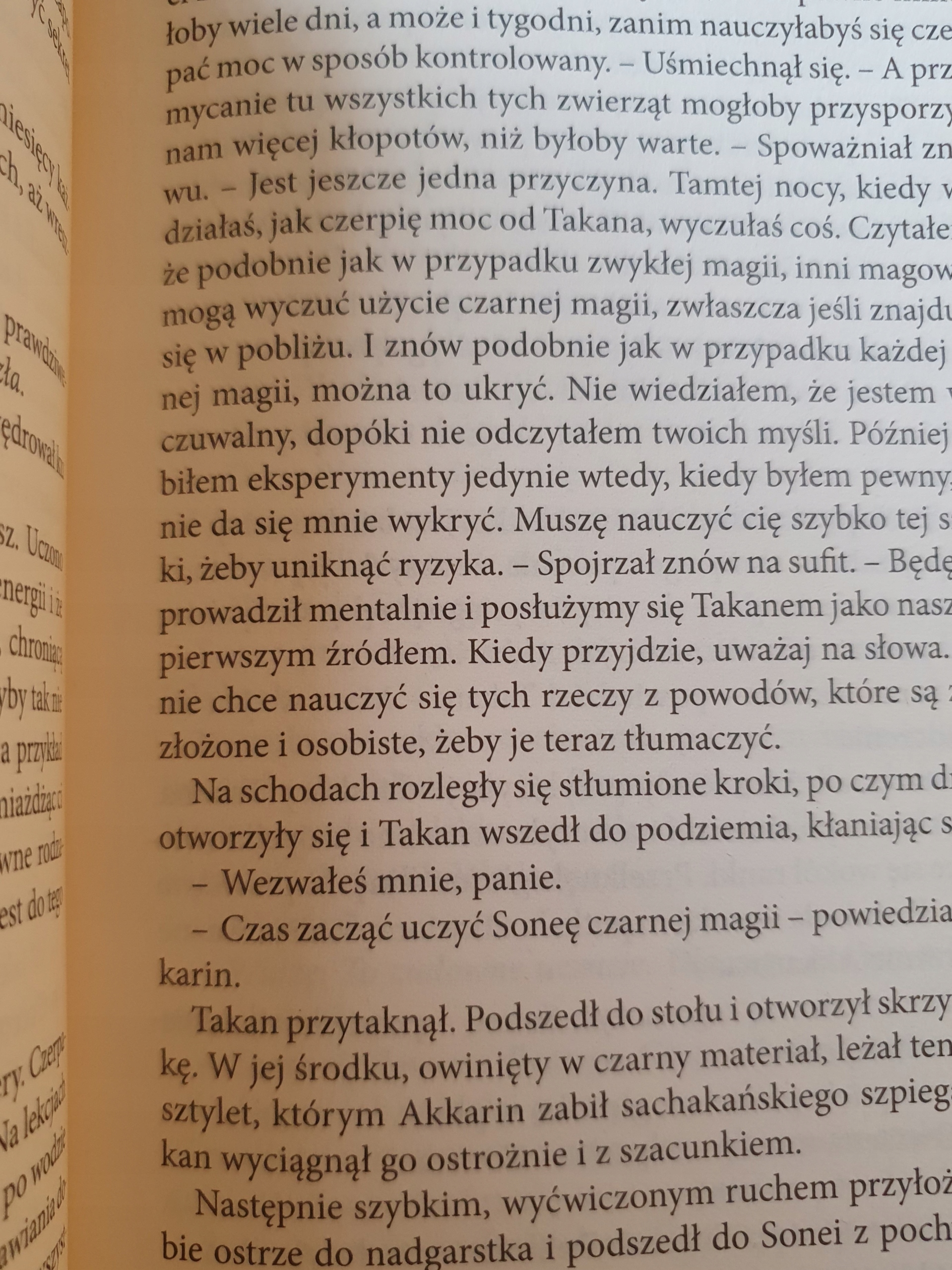 Sonea wiele nauczyła się w Gildii Magów. W ciągu ostatniego roku Regin dał jej spokój, a pozostali nowicjusze zaczęli traktować ją z niechętnym szacunkiem. Dziewczyna nie może jednak zapomnieć tego, co widziała w podziemnej komnacie Wielkiego Mistrza Akkarina, ani też ostrzeżenia, że odwieczny wróg Kyralii obserwuje czujnie Gildię.W miarę jak Akkarin ujawnia coraz więcej swojej wiedzy, Sonea przestaje być pewna, komu ufać ani czego bać się najbardziej. Czy prawda może być aż tak przerażająca, jak przedstawia ją Wielki Mistrz? A może jest to podstęp, mający skłonić ją do uczestnictwa w jego mrocznych intrygach?